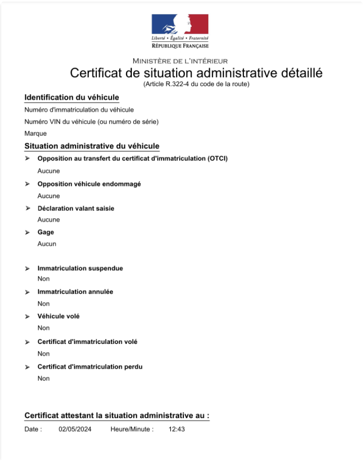 Le vendeur d’un véhicule d’occasion doit fournir un certificat attestant l'absence de gage et d'opposition. Ces informations sont regroupées dans un seul document : le certificat de situation administrative.