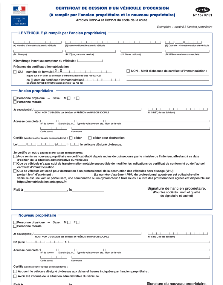 L’acheteur et le vendeur doivent chacun garder une copie. Le vendeur doit aussi déclarer la cession en ligne dans les 15 jours.